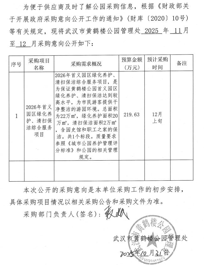武汉市黄鹤楼公园采购意向公开(参考文本)